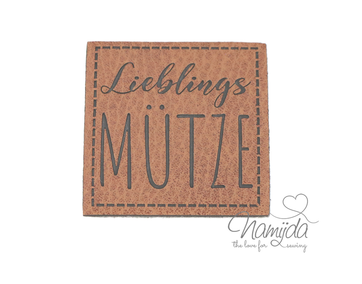 1 Stück - DENIM KuNSTLEDER LABEL - Lieblings MÜTZE - AUFNÄHER MIT VORGEDRUCKTER NÄHNAHT - 40mm x 40mm