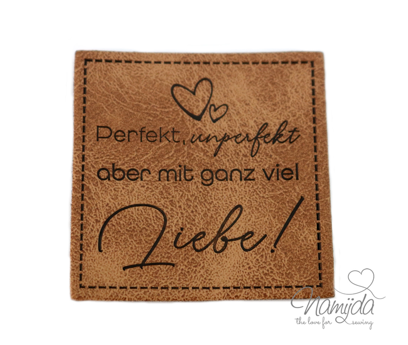 1 Stück - KuNSTLEDER LABEL - Perfekt, unperfekt aber... - AUFNÄHER MIT VORGEDRUCKTER NÄHNAHT - 40mm x 40mm