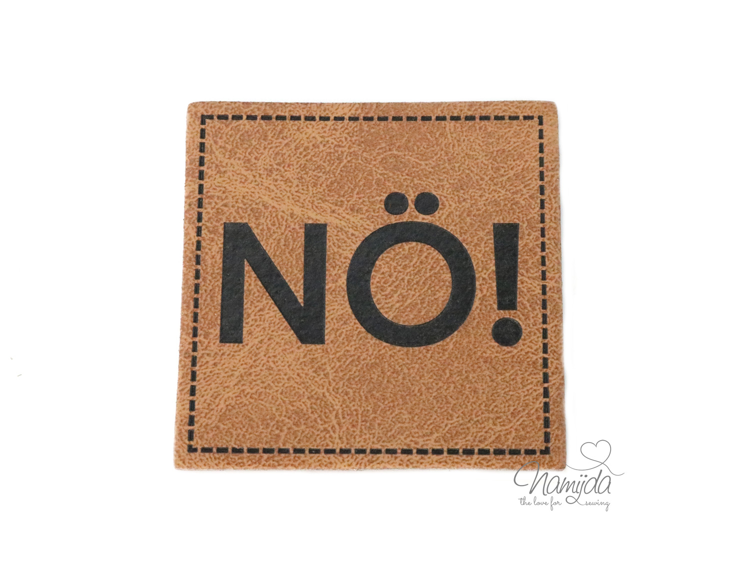 1 Stück - XL KuNSTLEDER LABEL NÖ! - AUFNÄHER MIT VORGEDRUCKTER NÄHNAHT - 40mm x 40mm