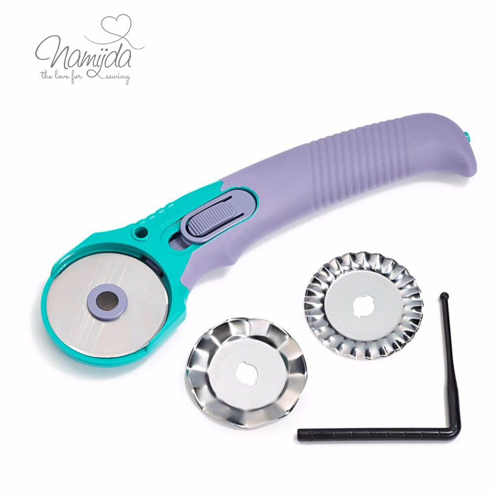 Der Prym Rollschneider Multi hat einen ergonomisch geformten und gummierten Griff, der angenehm und sicher in der Hand liegt. Das Set enthält eine Klinge von 45mm Durchmesser zum Schneiden von mehreren Lagen Stoff. Mit dem Abstandhalter, der einfach zu montieren ist, können Nahtzugaben mühelos mitgeschnitten werden. Auch eine Wellen- und Zackenklinge ist enthalten, mit der Stoffkanten schnell in Form geschnitten werden können.