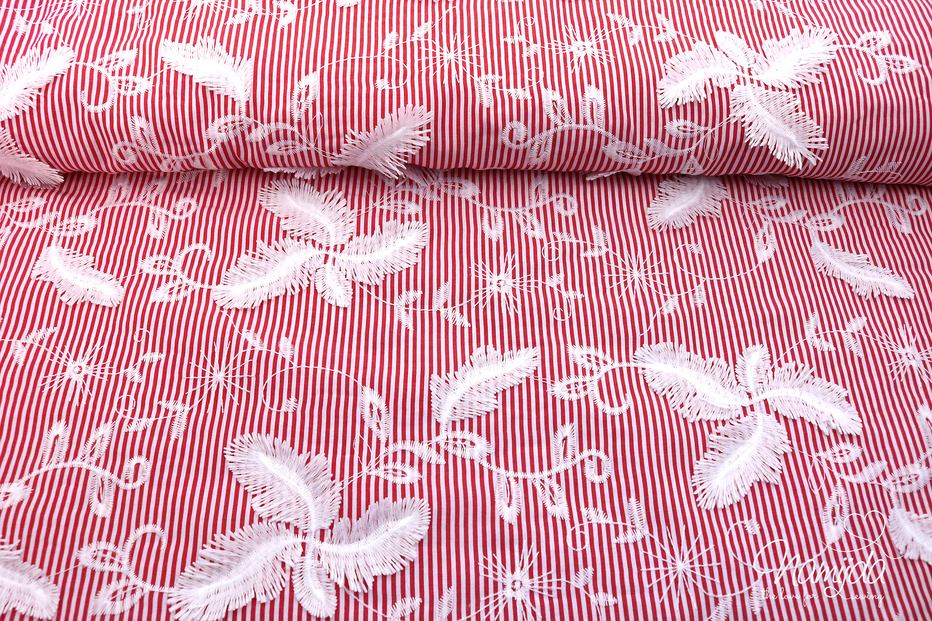 0,5 Meter ♥ wunderschöner, mit Blumen bestickter Baumwollstoff in zarten Rot/Weiss gestreift ♥